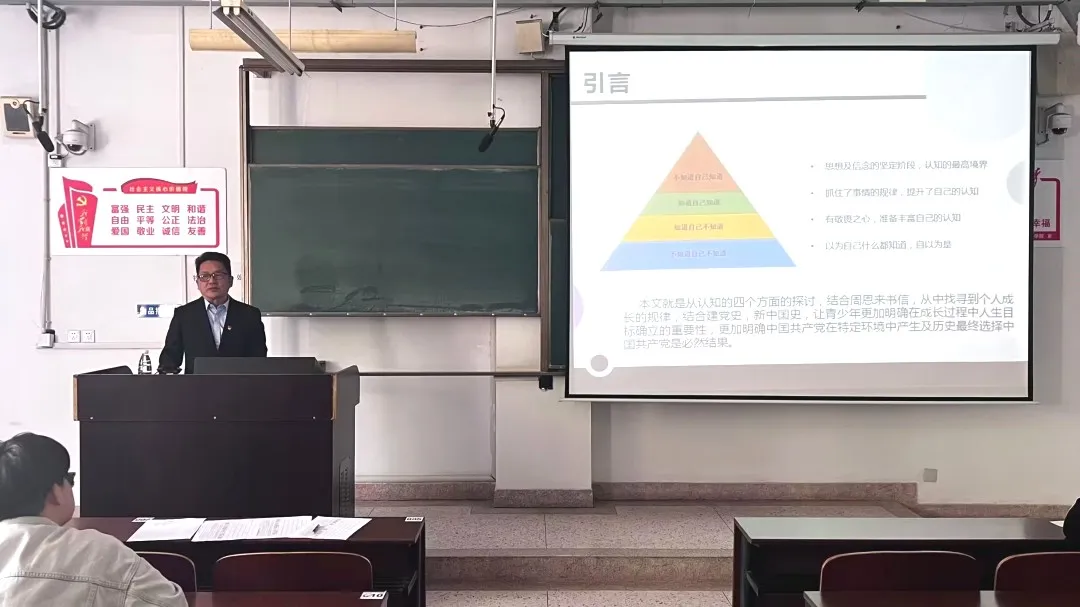 崔传武带领同学们从认知的四个方面进行探讨,结合周恩来书信,从中找寻到个人成长的规律,结合建党史、新中国史,强化青年对“知行合一”的认知程度以及采取相应行为措施。他提出,同学们要在成长过程中明确人生目标,深化对“不知己不知;知之已不知;知之己知之;不知己知之”的理解。