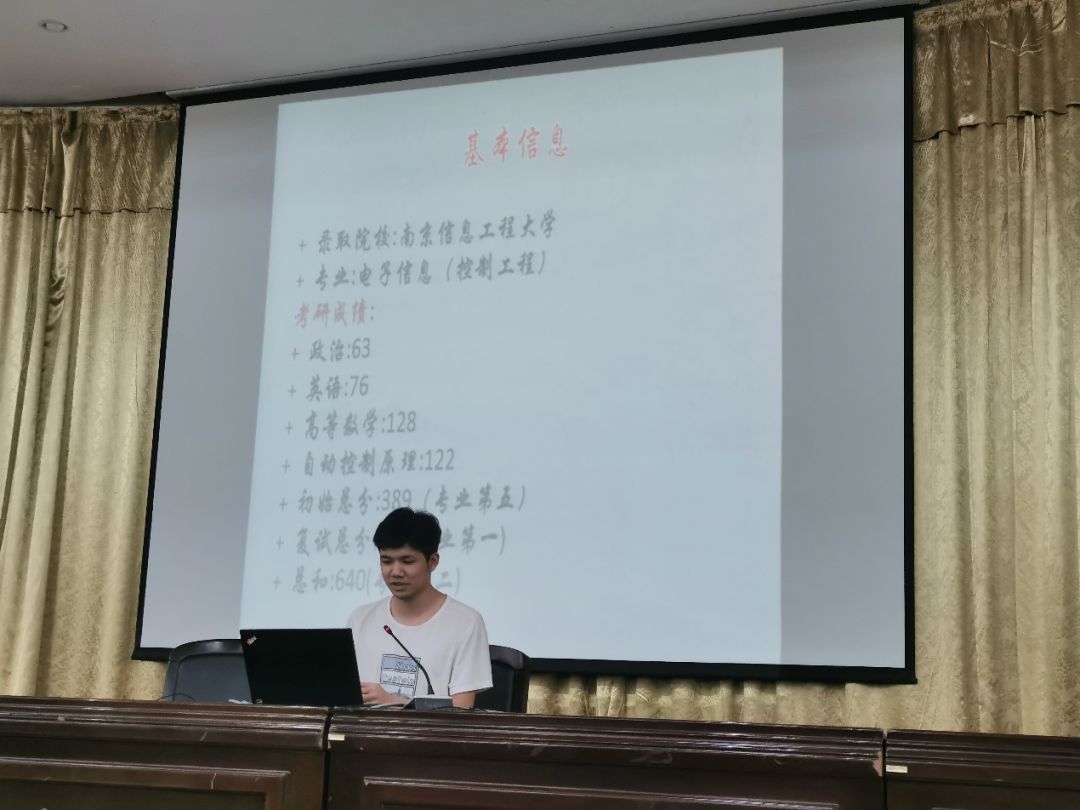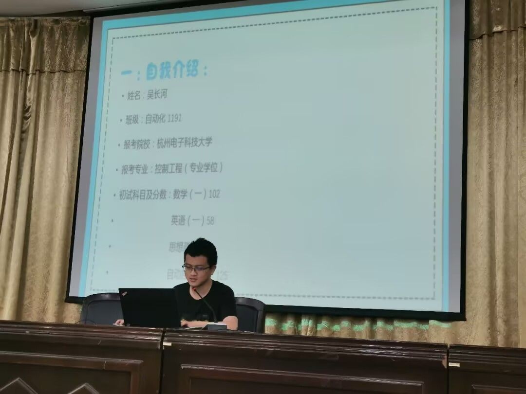 会上,自动化学院2019级丁潘韬、卢国瑞、吴长河、袁泉、吴卿分别从为何考研考公、考研择校、考研复习科目、参考书目、考研心态等多方面向2020级学弟学妹们传授了自己的考研经验与学习心得,并祝愿2020级备考的学弟学妹们一战成硕,考入理想的院校。